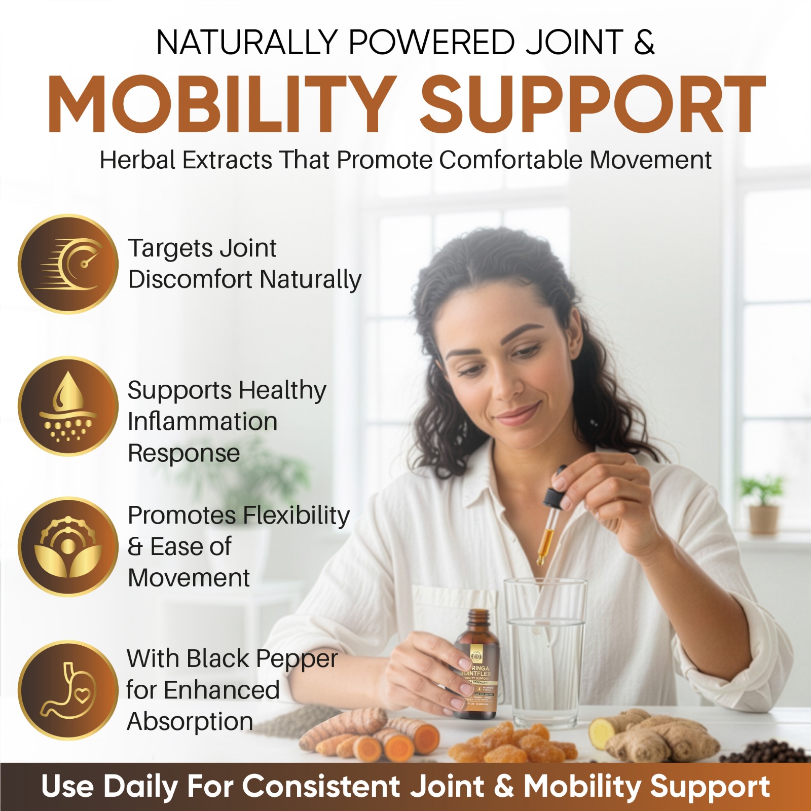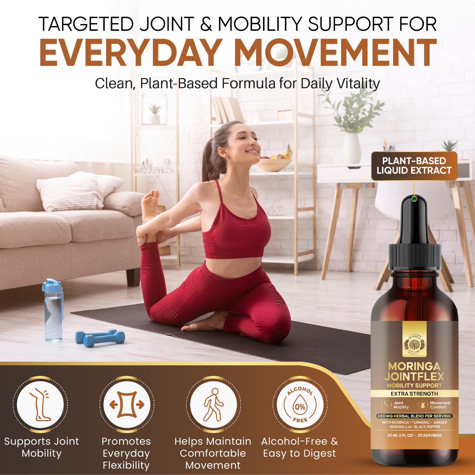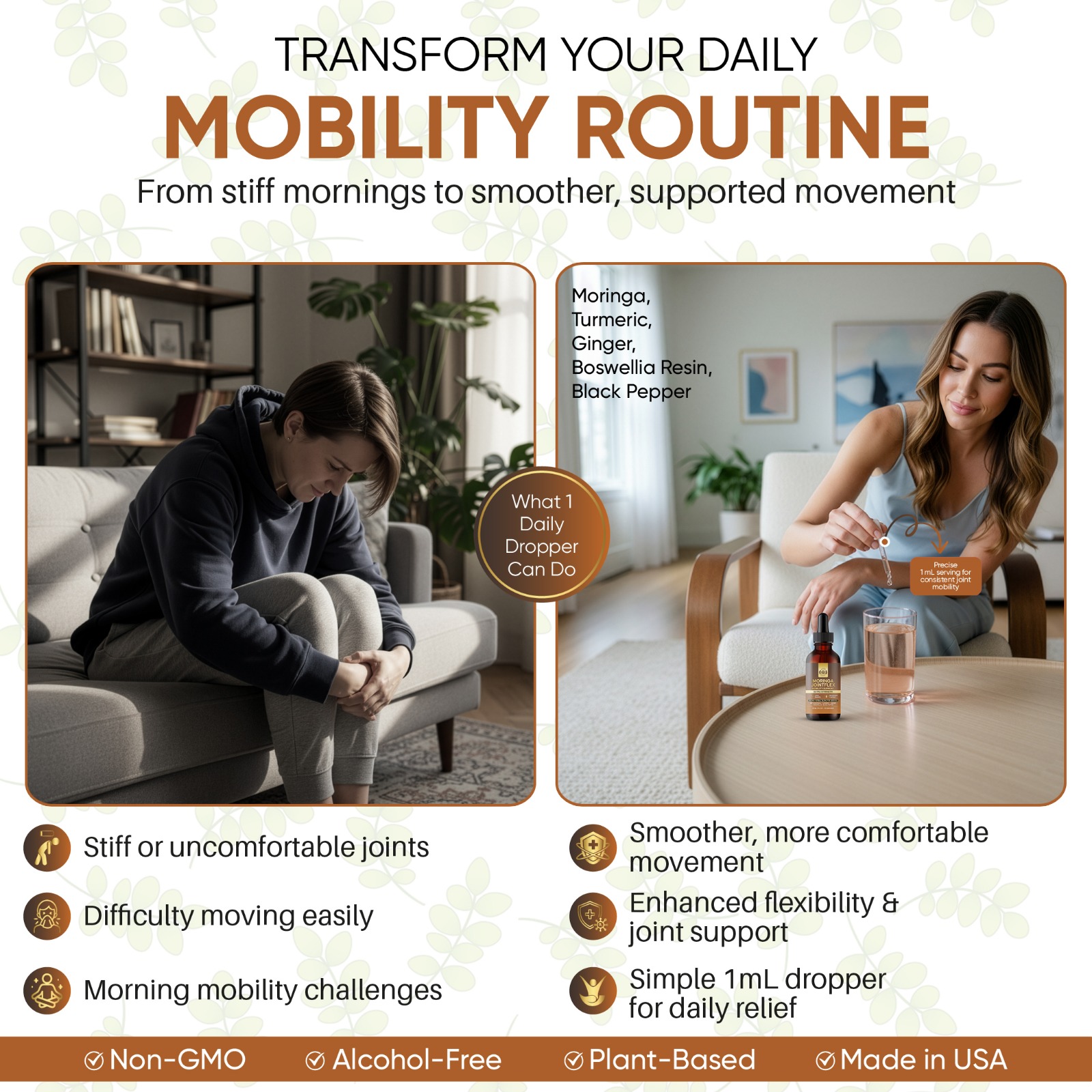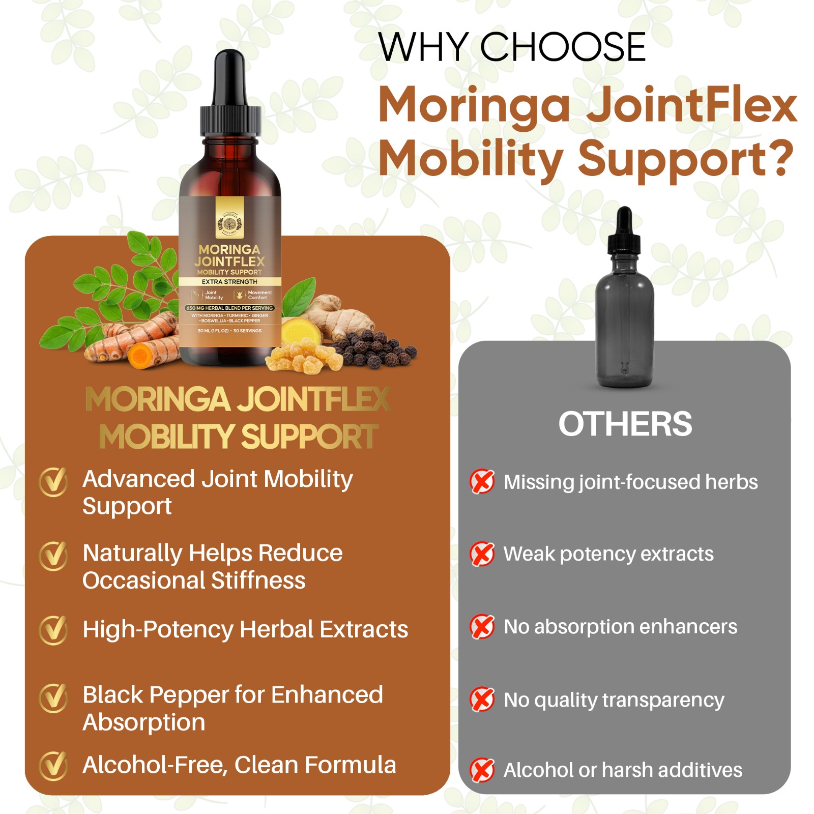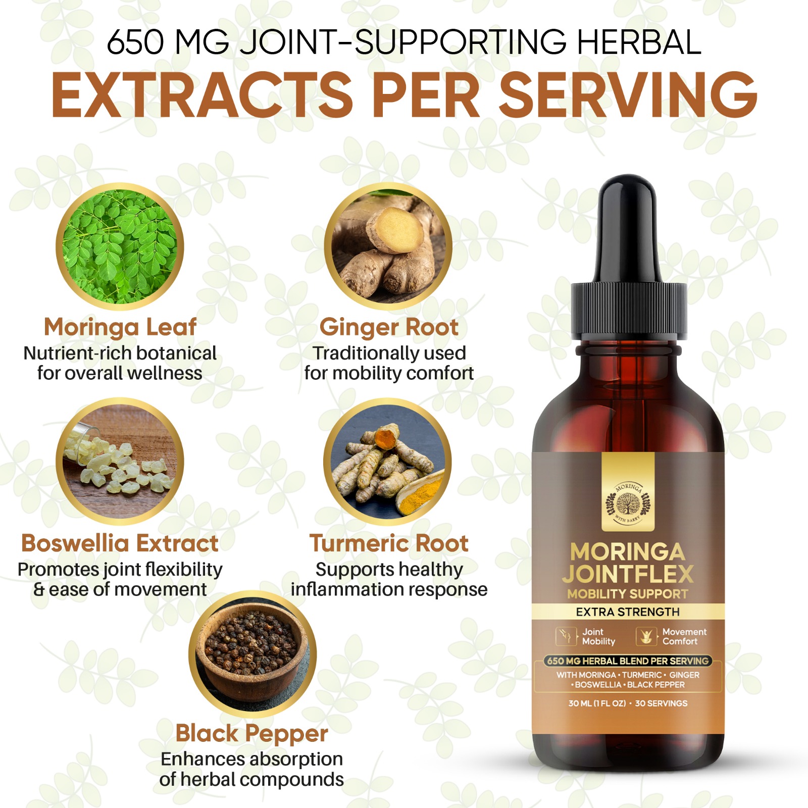 Moringa Joint Flex Mobility Support Extract Multi Herb Botanical Drops with Turmeric Ginger Boswellia Black Pepper 650 MG Joint Comfort Formula